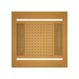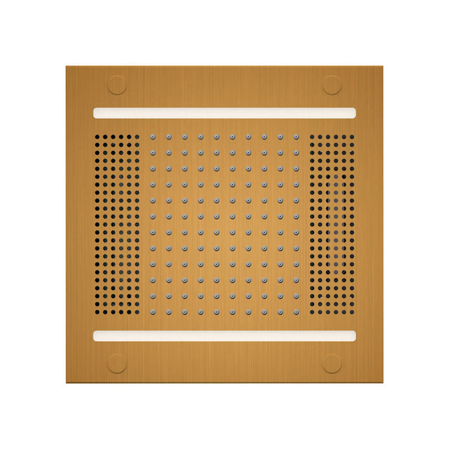 Ceiling-mounted, all-in-one brass module with integrated light, sound, and rainhead.